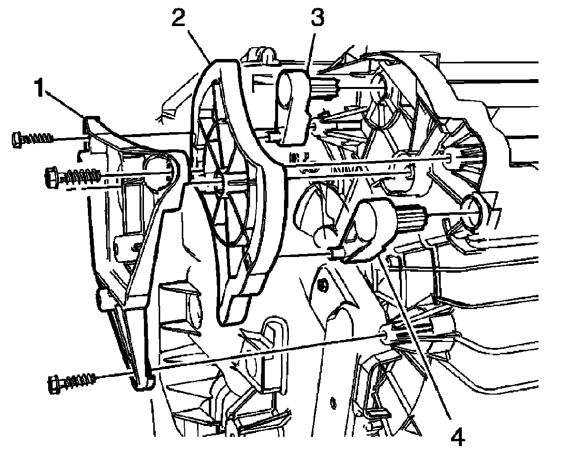 4. Install the mode cam levers (3) to the evaporator case assembly.