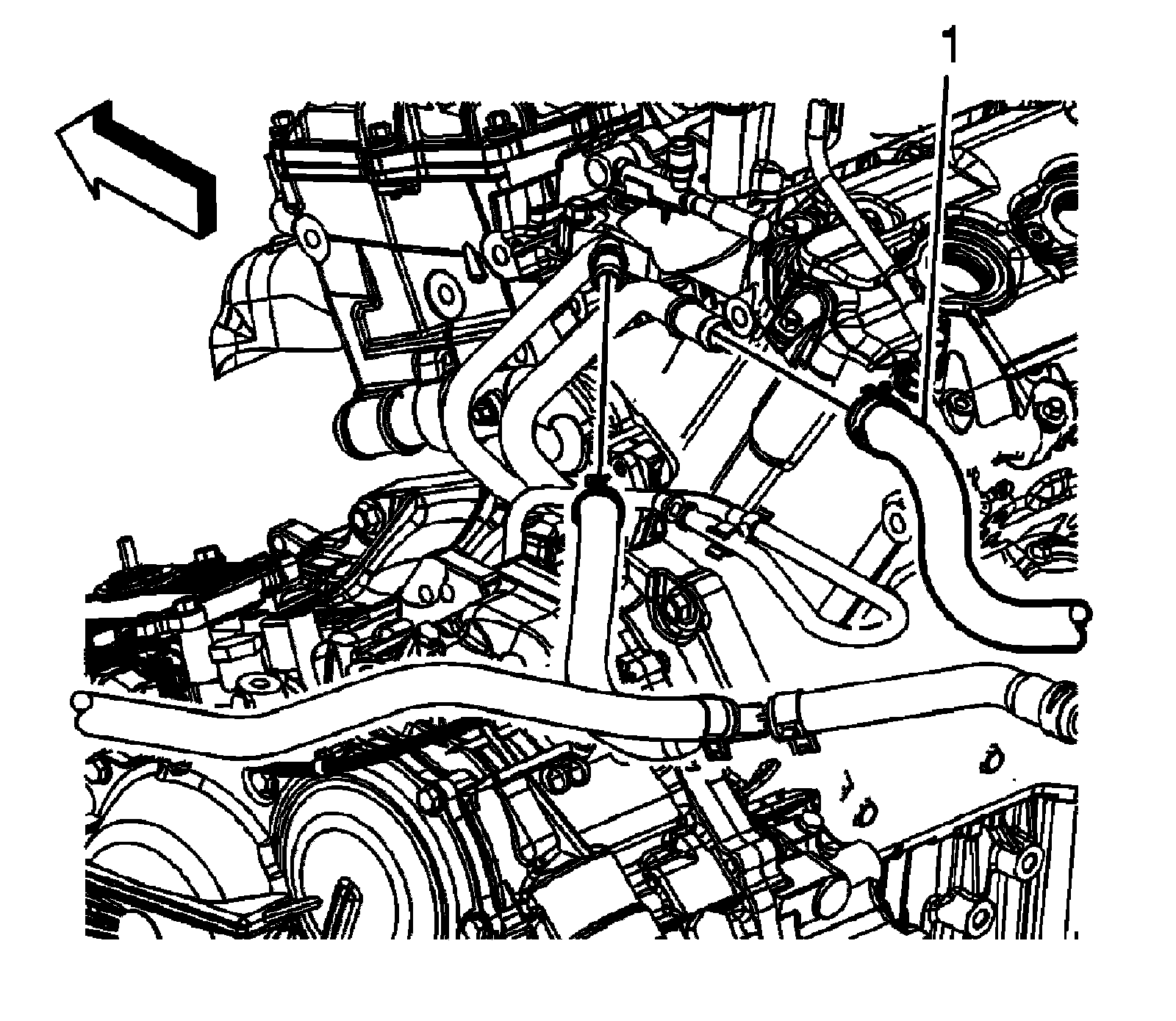 3. Install the heater inlet hose (1) to the heater inlet pipe.