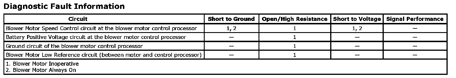 ^ If the test lamp always OFF, test the speed control circuit for a short to voltage or an open/high resistance. If the circuit tests normal, replace the HVAC control module.