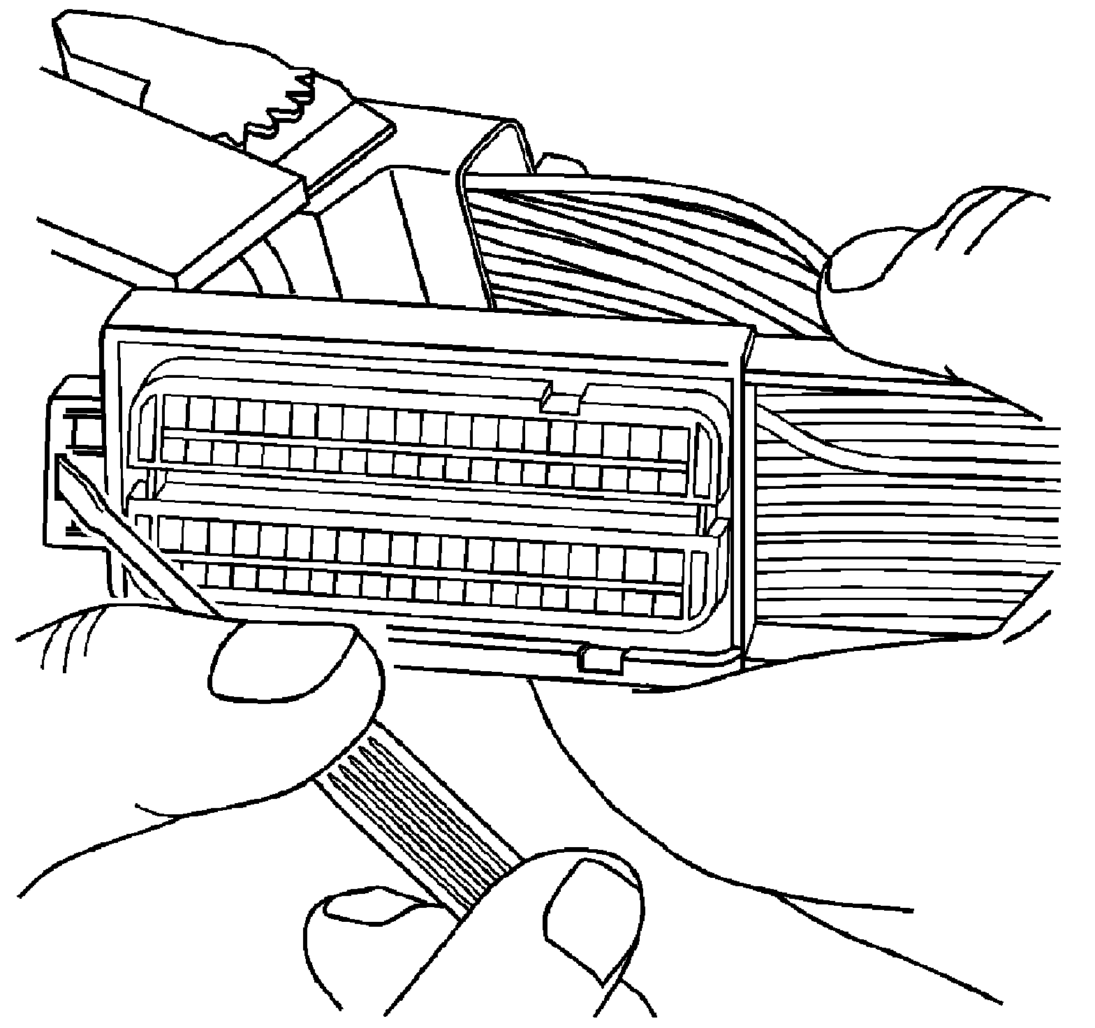 3. Locate the dress cover locking tabs at the corners of the connector. Use a small flat-blade tool to release the locking tabs and remove the dress cover.