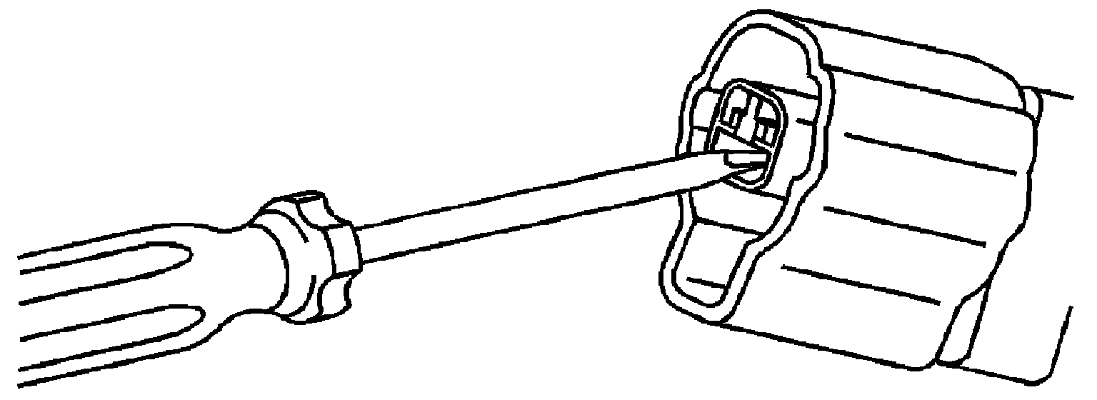 5. Insert the J 38125-553 (GM P/N 15315247) on a slight upward angle into the cavity below the terminal to be removed. Ensure that the pointed on the end of the tool is facing the bottom of the terminal and it stays in contact with the terminal until it stops on the plastic terminal retainer. See the release tool cross reference in the Reference Guide of the J-38125 to ensure that the correct release tool is used.