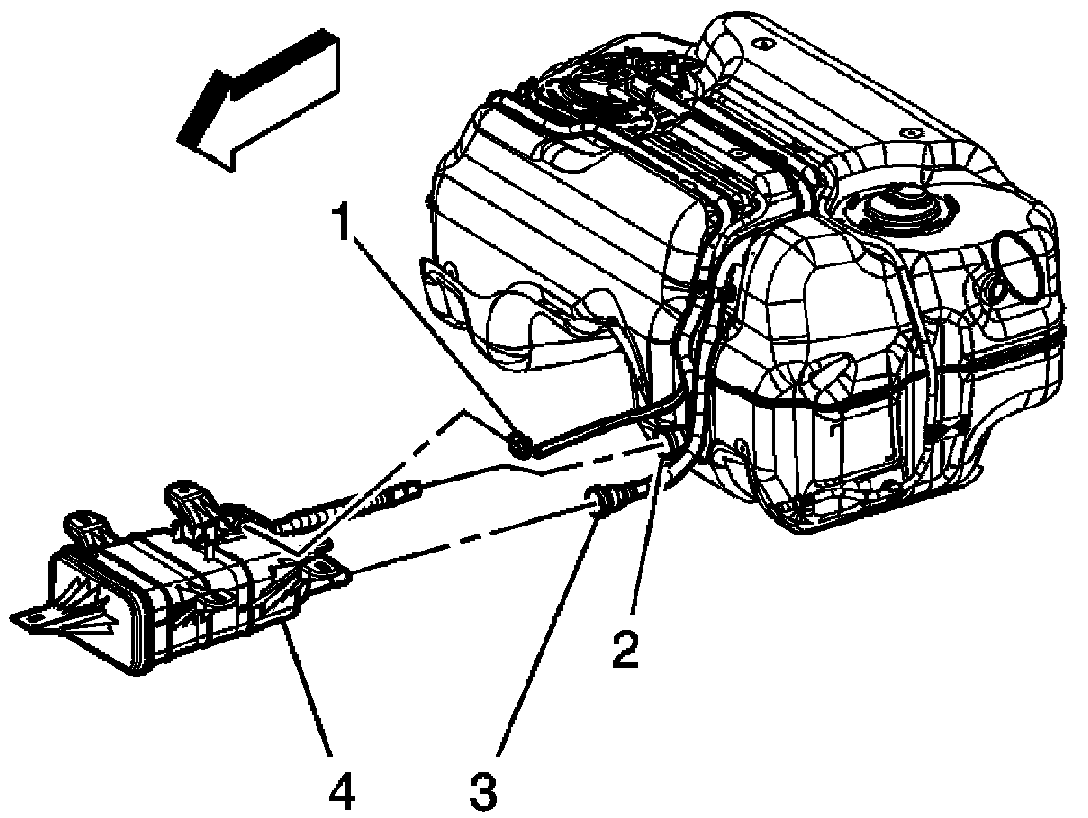 5. Disconnect the evaporative emission (EVAP) canister fresh air hose/pipe from the fuel tank fresh air hose/pipe (2). Refer to Plastic Collar Quick Connect Fitting Service.