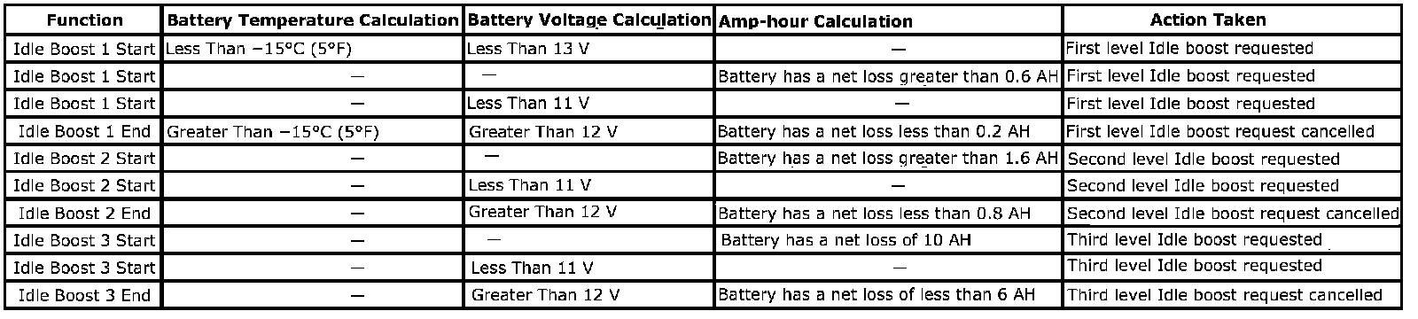 Idle boost is activated in incremental steps, idle boost 1 must be active before idle boost 2 can be active. The criteria used by the body control module (BCM) to regulate EPM are outlined given: