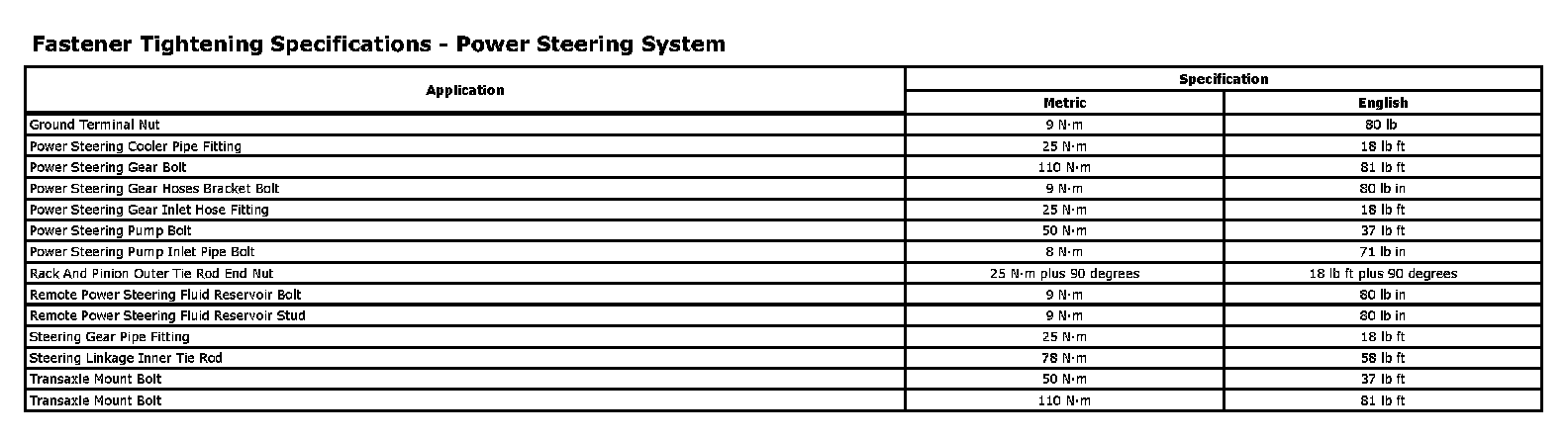 Fastener Tightening Specifications - Power Steering System: