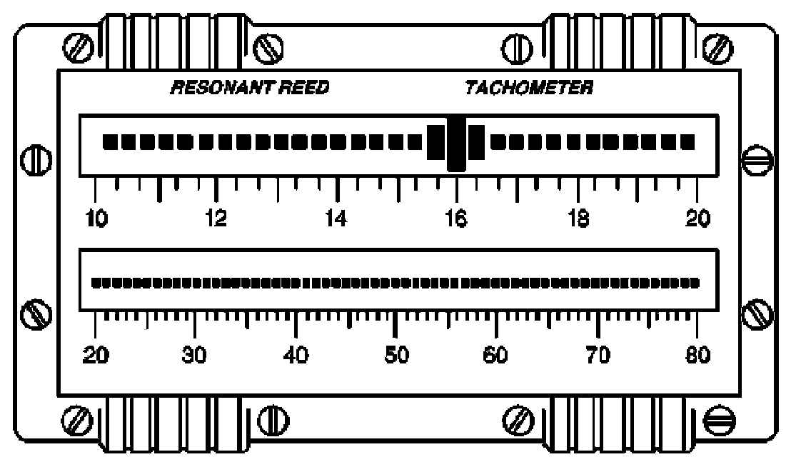 Reed Tachometer DescriptionThe reed tachometer consists of 2 rows of reeds arranged side-by-side. Each reed is tuned to vibrate or resonate when it is excited by a specific frequency. The reeds are arranged by their specific resonant frequency, increasing from left to right, ranging from 10 80 Hz. This arrangement allows for a visual display of the most dominate frequencies which fall within this range.