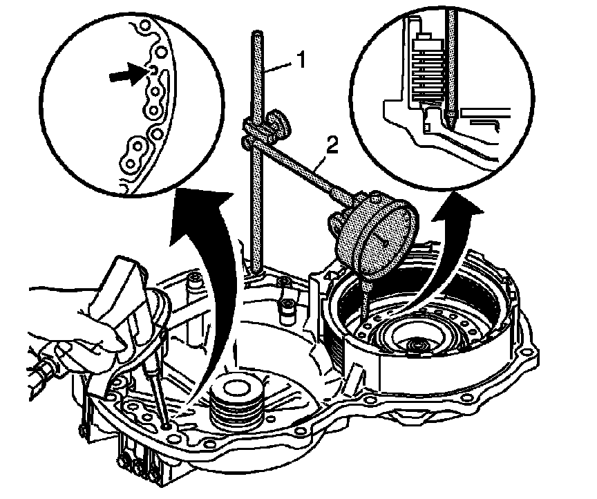 2. Install the J 45166 (1) into the forward clutch accumulator bolt hole that was not installed on the prior step. Assemble J 45200 (2) onto J 45166 (1) and set the dial indicator to zero.