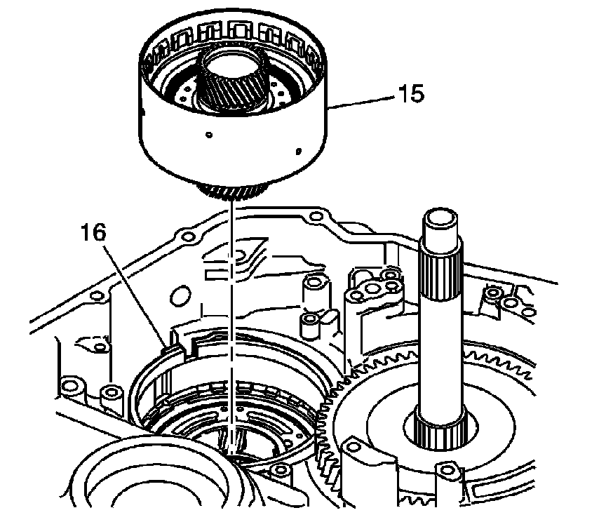 4-5 Clutch Assembly InstallationInstall the 4-5 clutch assembly (15) into the transmission case assembly, making sure not to disengage the third gear band assembly (16) from its holding points. When properly installed, the 4-5 clutch assembly (15) should spin freely by hand with no drag on the third gear band assembly (16).