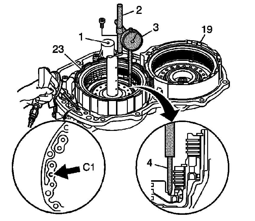 7. Apply compressed air to the C1 fluid passage in the case and measure the forward clutch piston stroke.