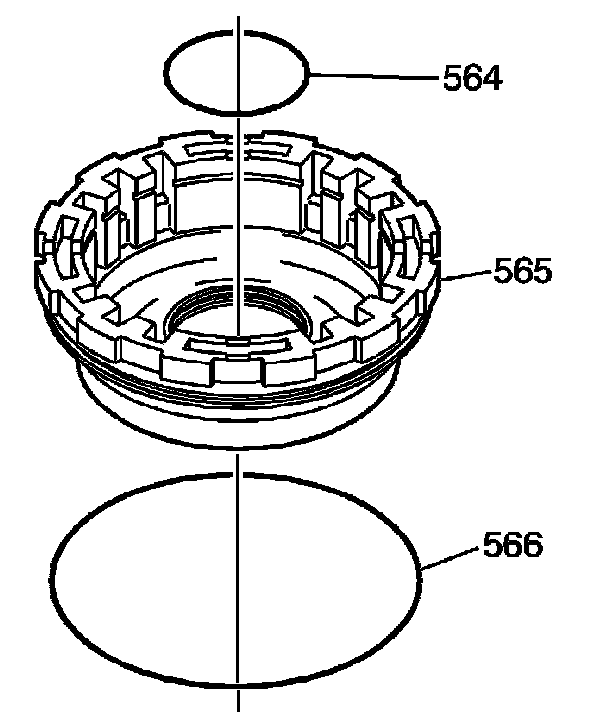 11. Install the forward clutch piston inner seal (564) and the forward clutch piston outer seal (566) onto the forward clutch piston (565).