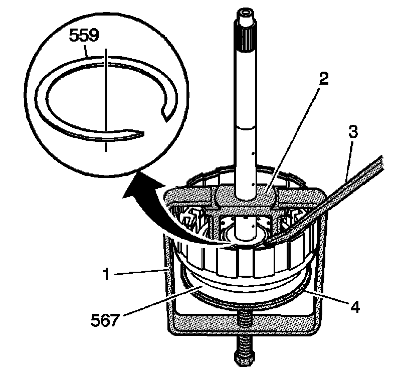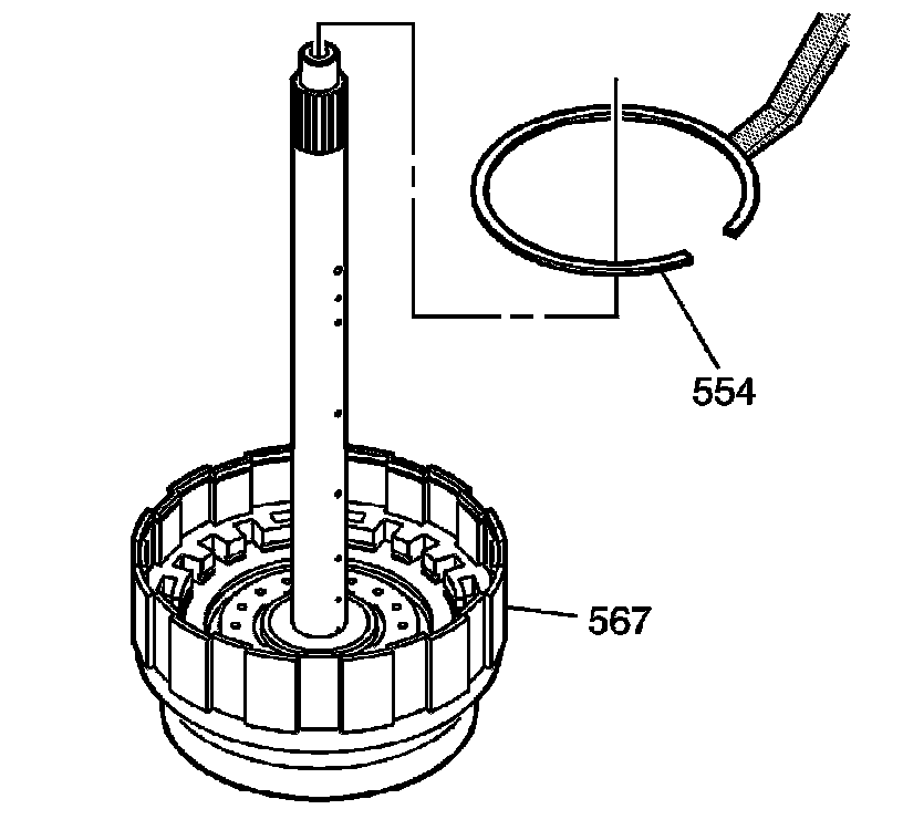 24. Install the direct clutch backing plate retaining ring (554) into the groove in the forward and direct clutch housing assembly - with input shaft (567) using J 28585.