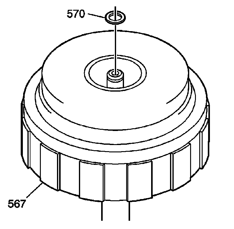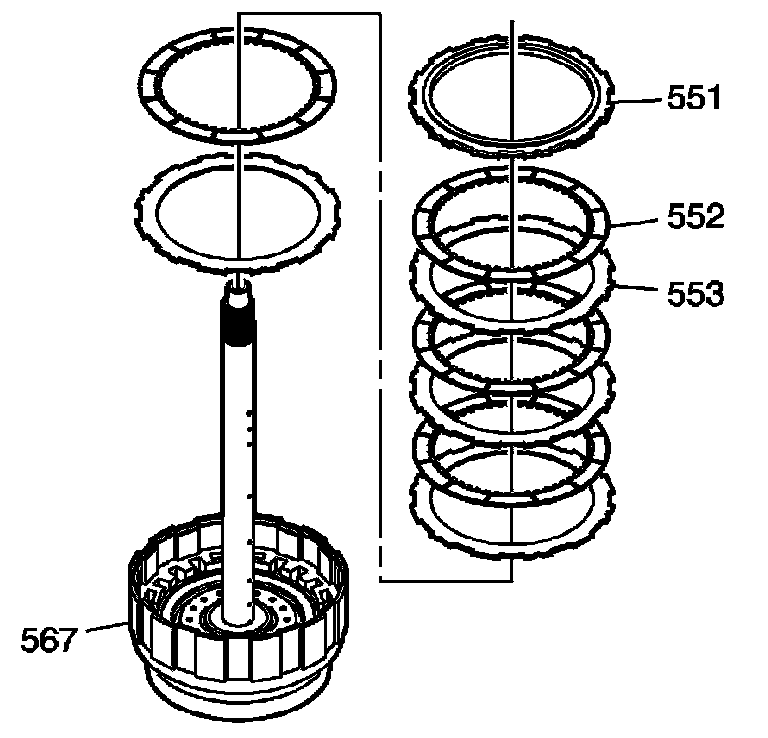 14. Press, by hand, the forward clutch piston (565) into the forward and direct clutch housing assembly - with input shaft.