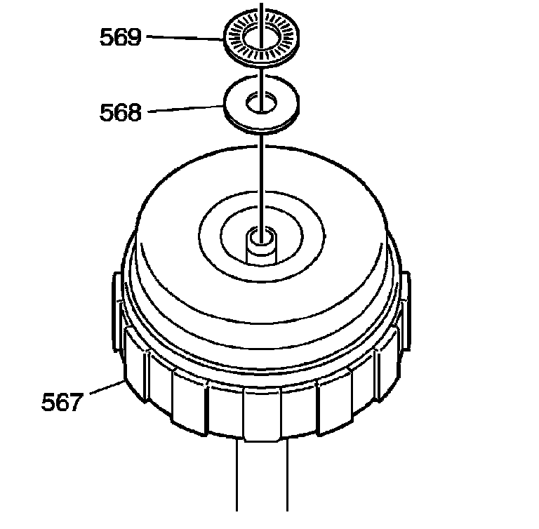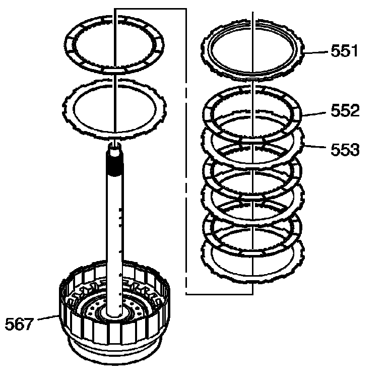 2. Remove the forward clutch housing thrust bearing (569) and the forward clutch housing thrust bearing race (568) from the forward and direct clutch housing assembly - with input shaft (567).
