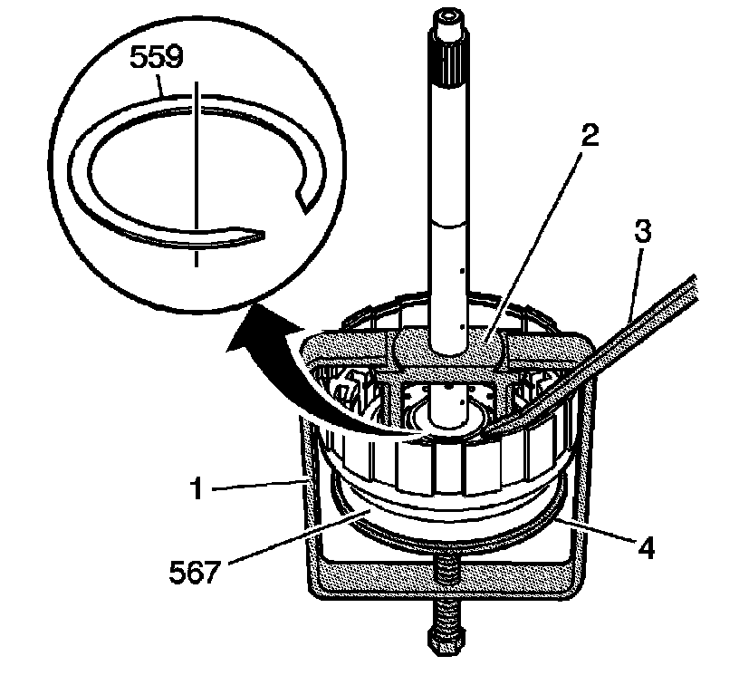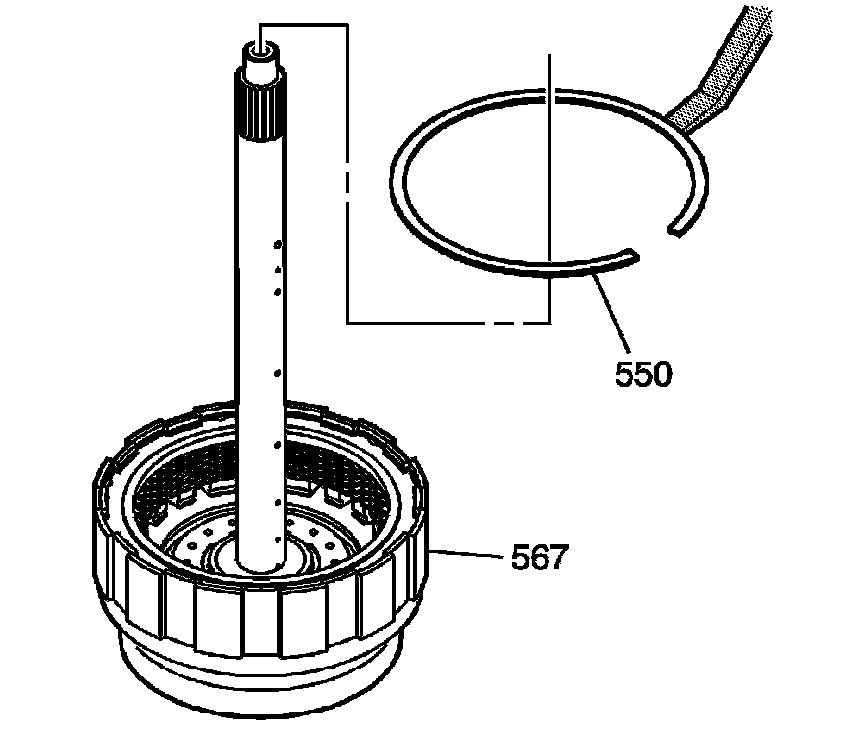 3. Using J 28585, remove the forward clutch backing plate retaining ring (550) from the forward and direct clutch housing assembly - with input shaft (567).