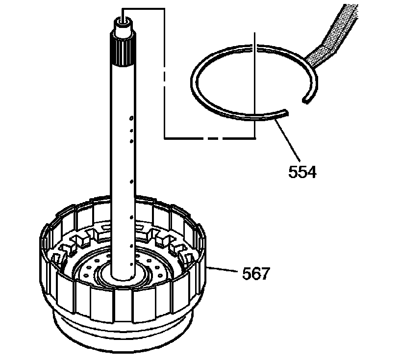 5. Using J 28585, remove the direct clutch backing plate retaining ring (554) from the forward and direct clutch housing assembly - with input shaft (567).