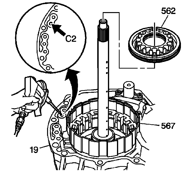 10. While pulling on the piston by hand, apply compressed air into the fluid passage (C2) in order to remove the direct clutch piston (562).
