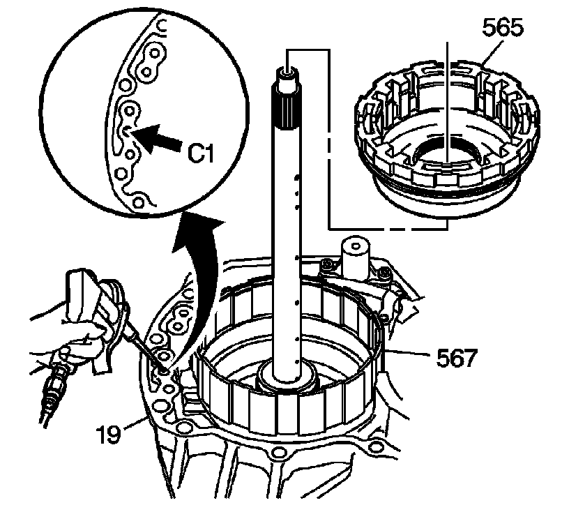 12. While pulling upward on the piston by hand, apply compressed air into the fluid passage (C1) in order to remove the forward clutch piston (565).