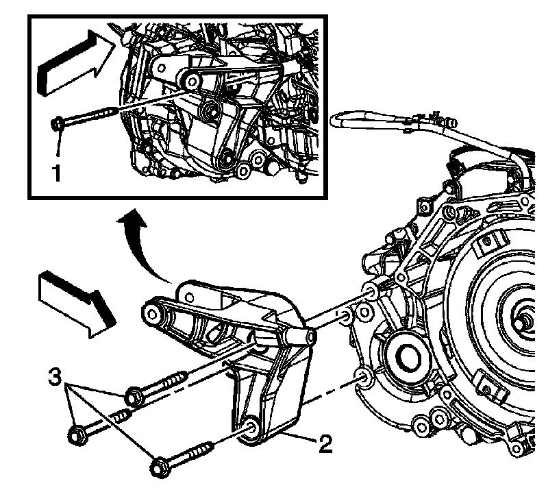3. Remove the transaxle mount bracket bolts (1, 3).