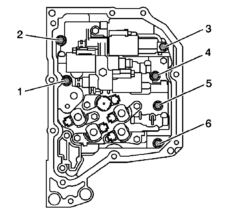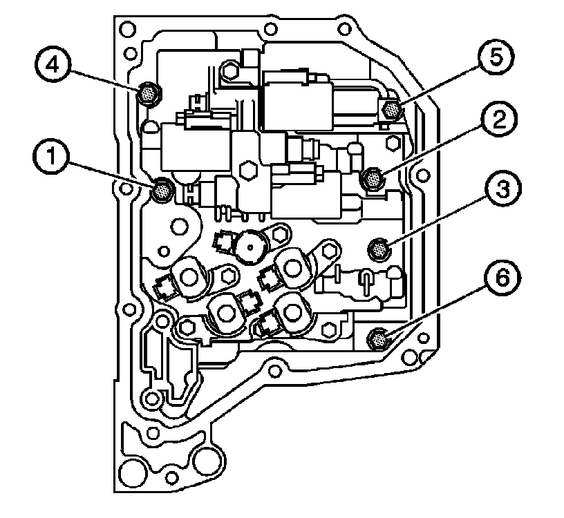 3. Remove the 6 control valve body mounting bolts/screws (1-6).