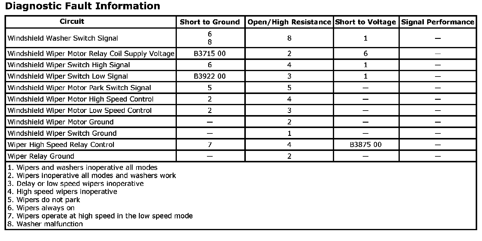 2. A short to B+ on any of the wiper/washer switch signal circuits will open the ground trace in the wiper switch.