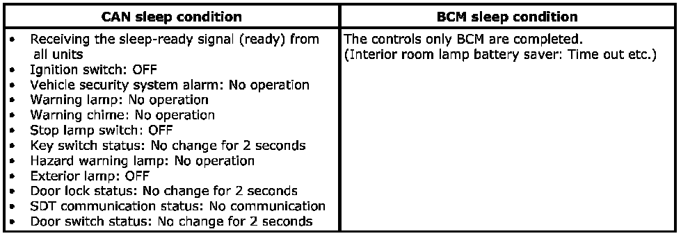 - BCM is in the low power consumption mode and perform the low power consumption control when all of the BCM sleep conditions are fulfilled with CAN sleep condition.