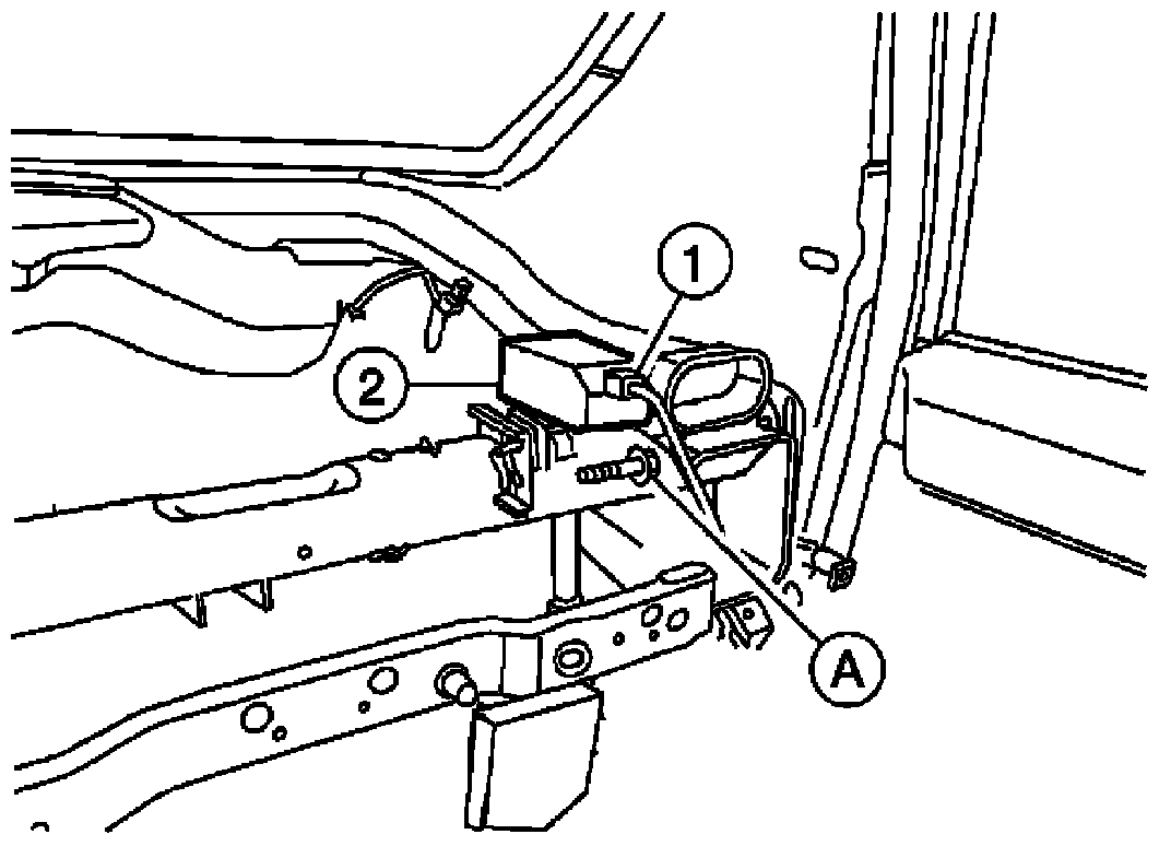 6. Remove the bolt (A), disconnect the harness connector (1) and remove the remote keyless entry receiver (2).
