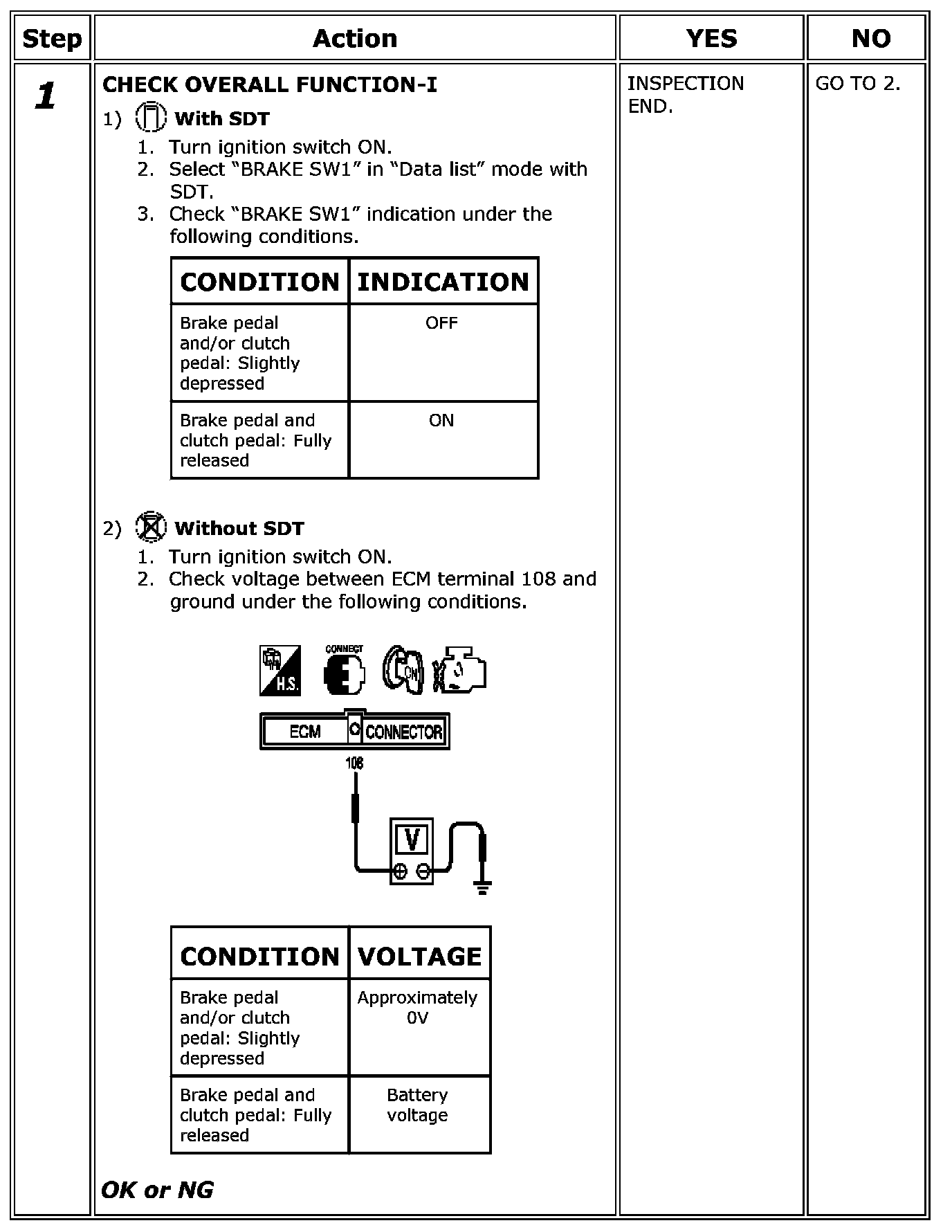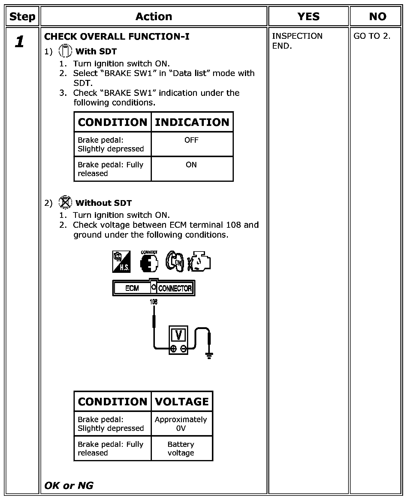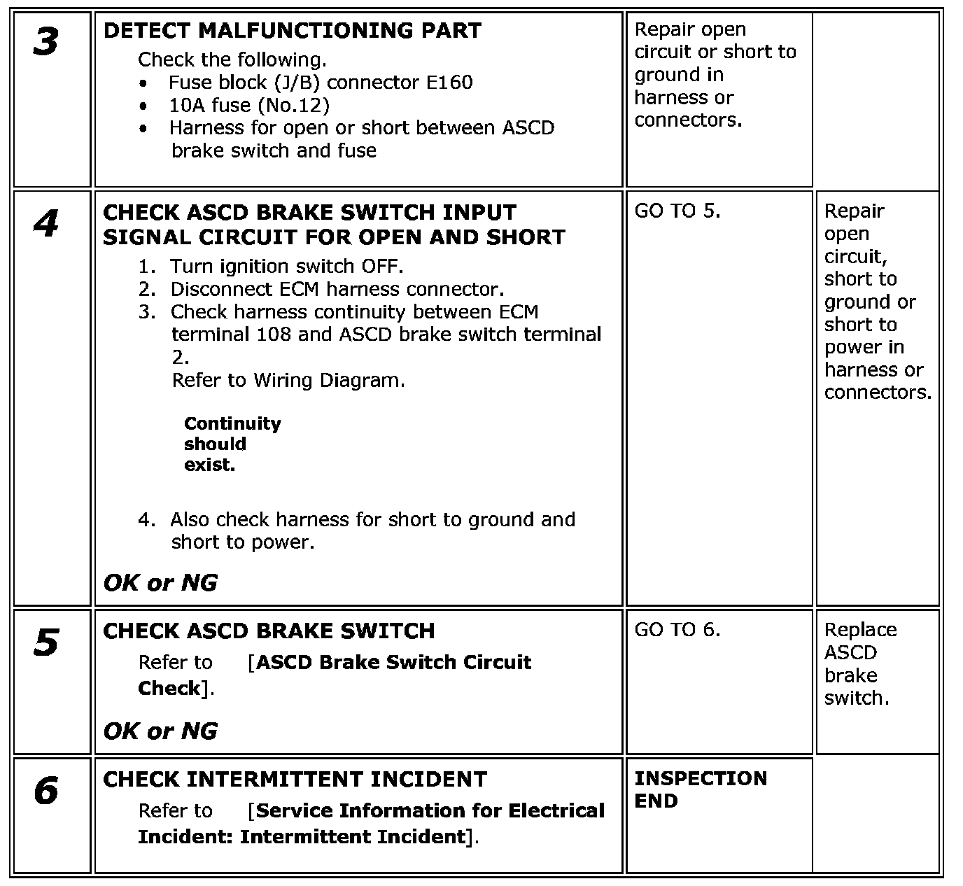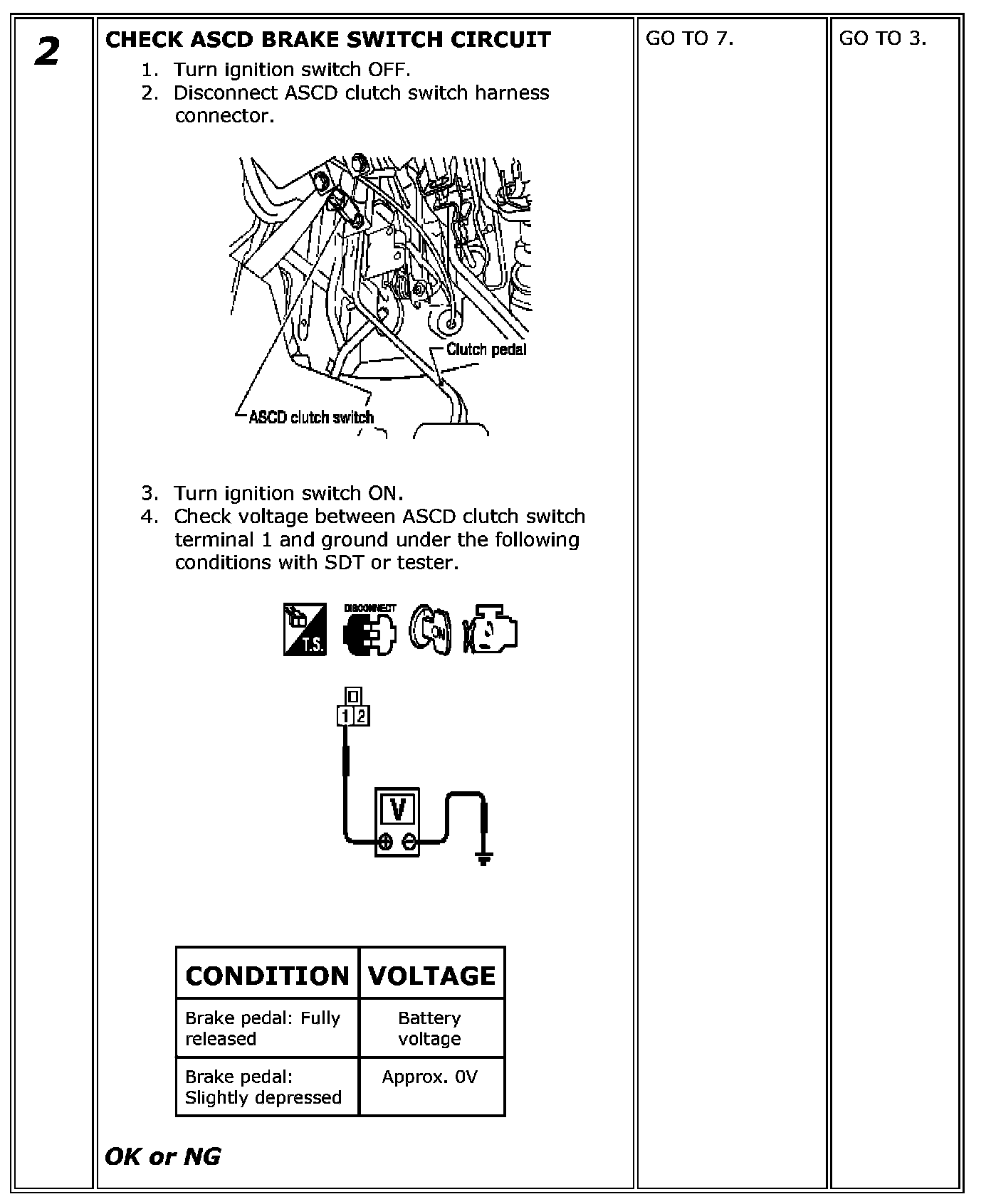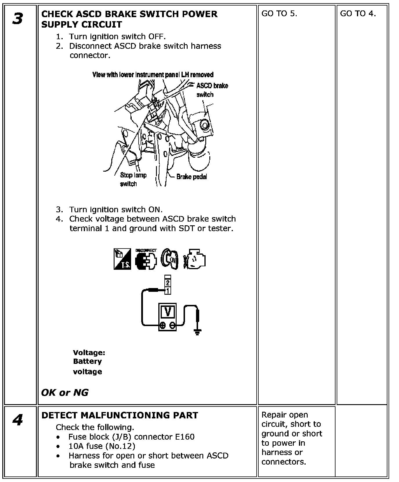 If NG, adjust ASCD brake switch installation and perform step 3 again.