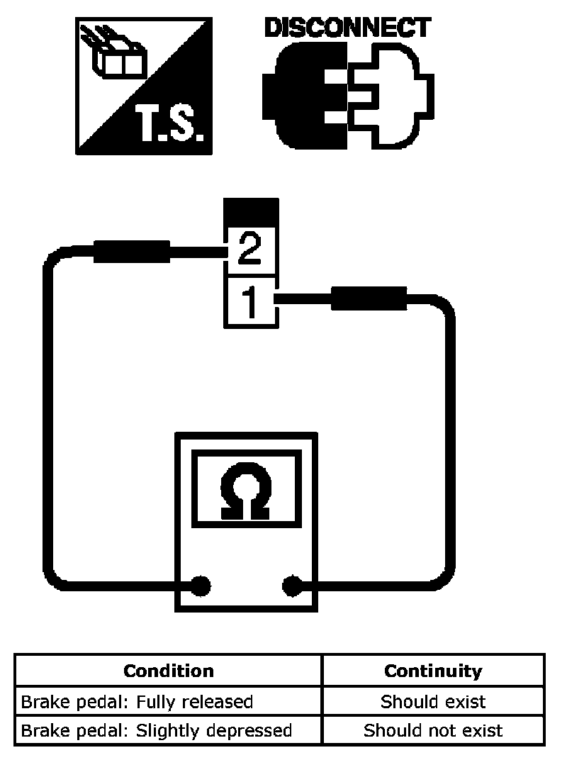 3. Check continuity between ASCD brake switch terminals 1 and 2 under the following conditions.
