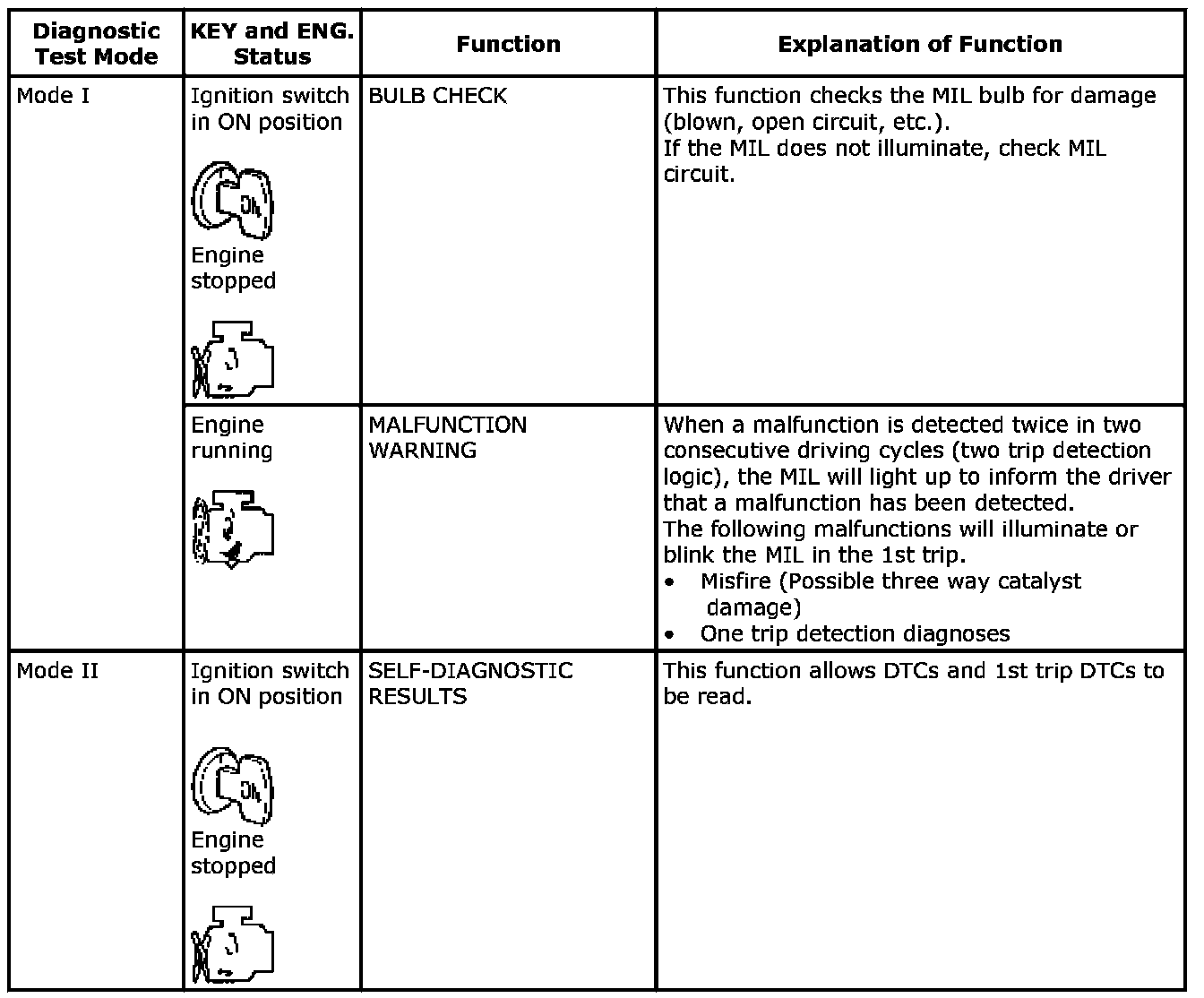 1. The MIL will illuminate when the ignition switch is turned ON without the engine running.This is a bulb check.