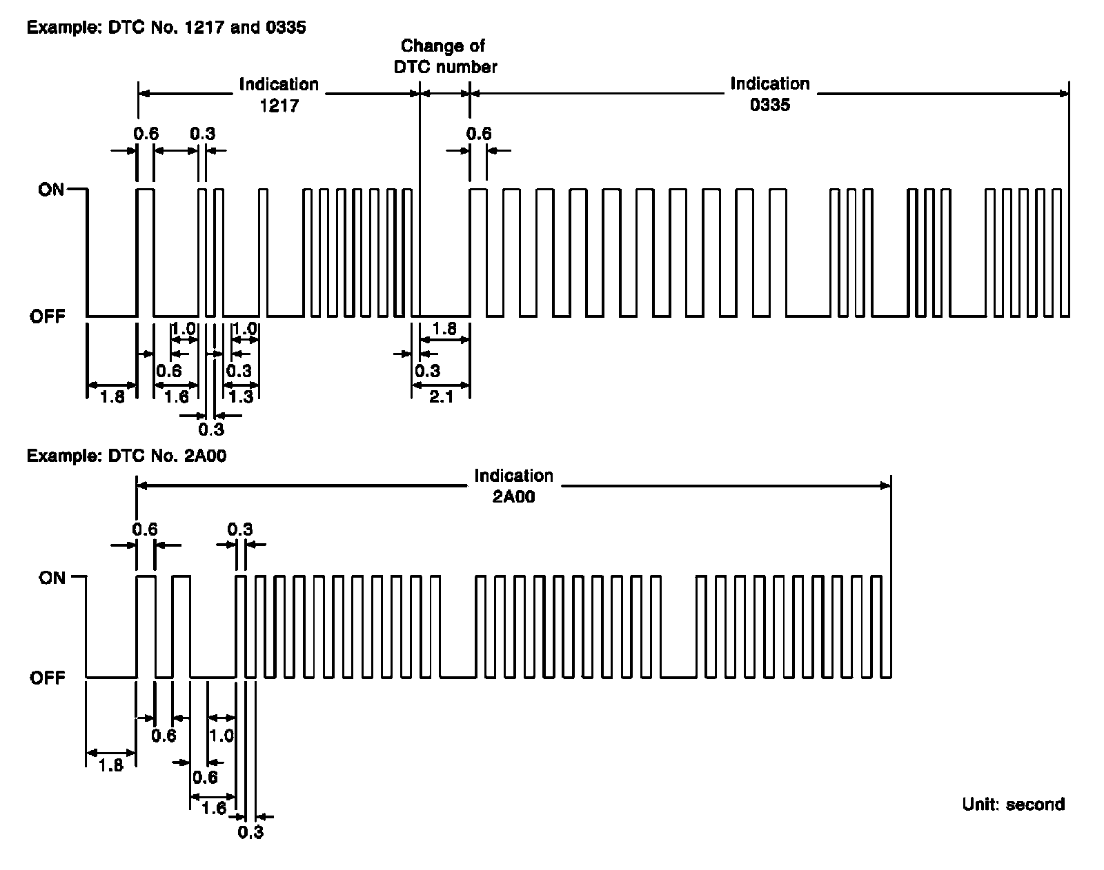 A change from one trouble code to another occurs at an interval of 1.8-second OFF. In this way, all the detected malfunctions are classified by their DTC numbers. The DTC 0000 refers to no malfunction.