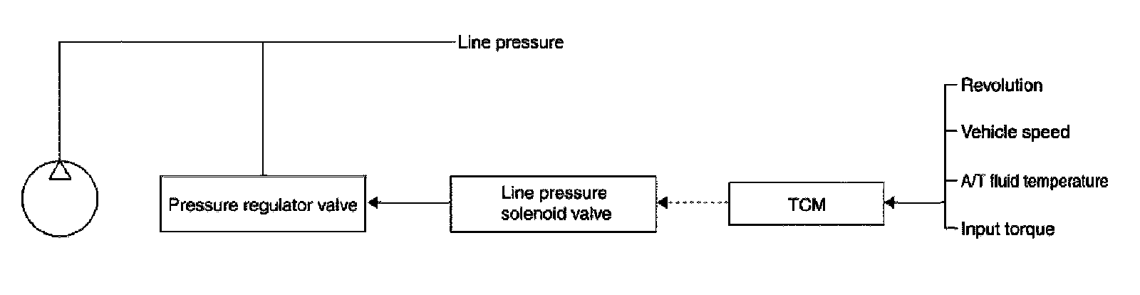 A/T Control System: Line Pressure Control^ When an input torque signal equivalent to the engine drive force is sent from the ECM to the TCM, the TCM controls the line pressure solenoid.