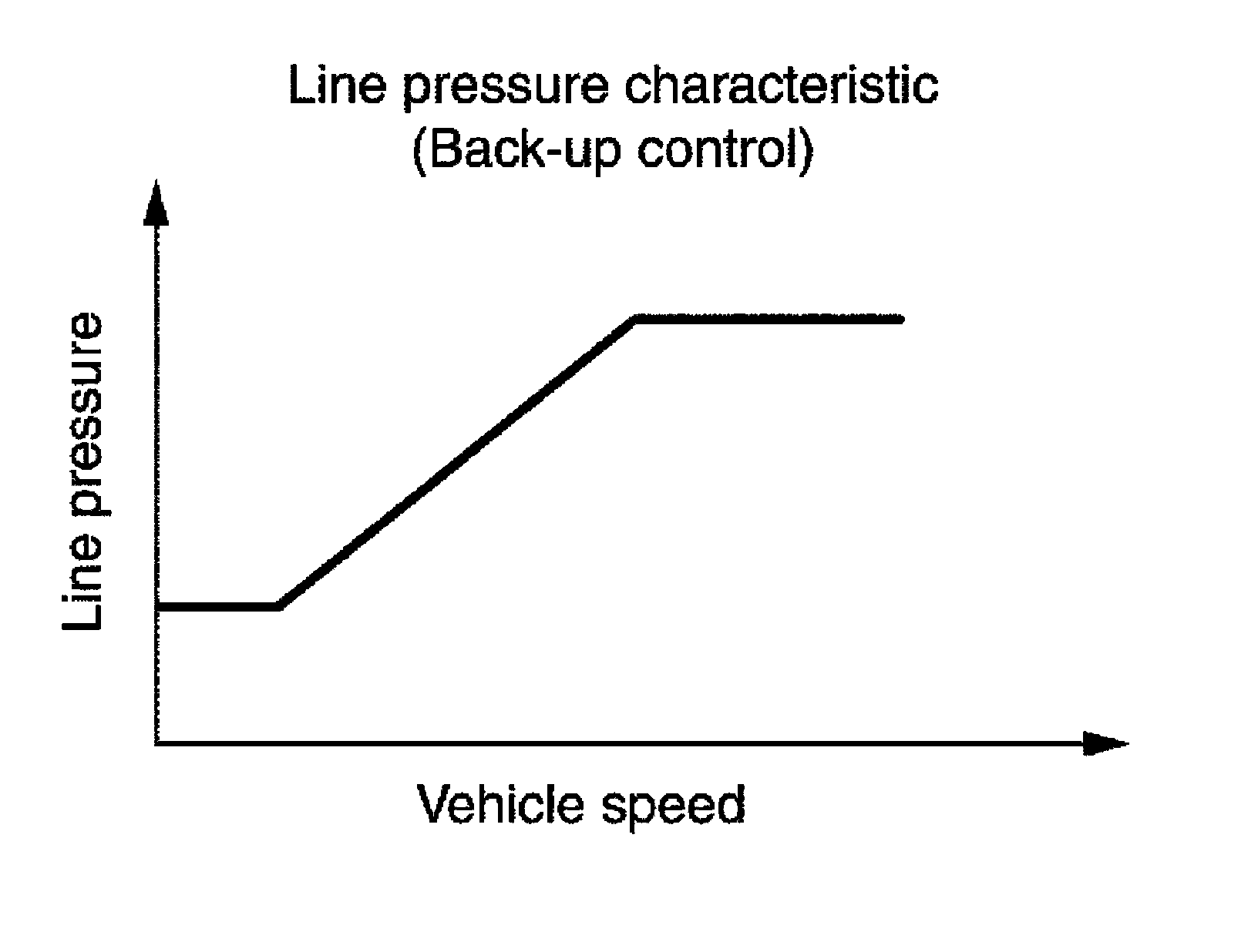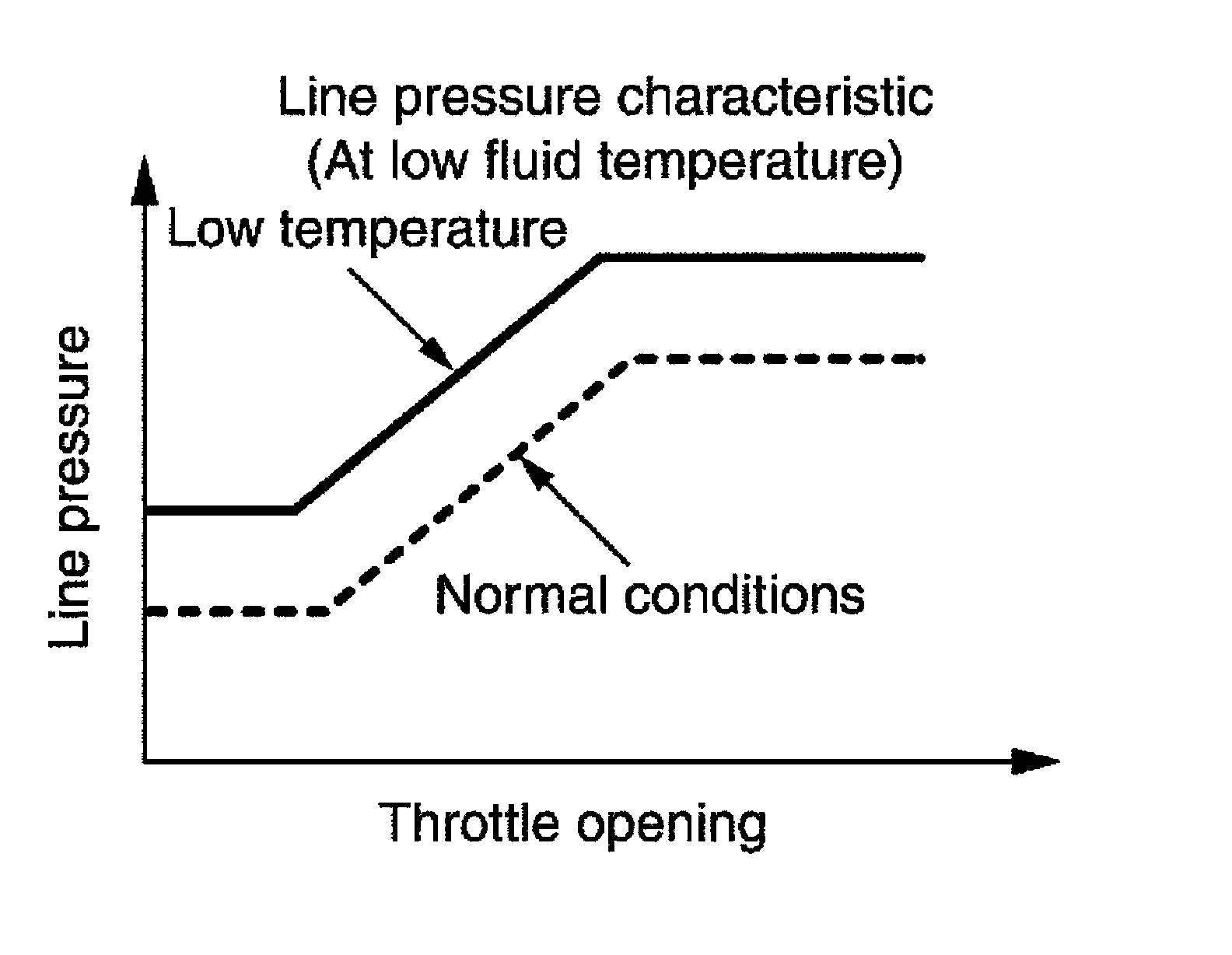 When the A/T fluid temperature drops below the prescribed temperature, in order to speed up the action of each friction element, the line pressure is set higher than the normal line pressure characteristic.