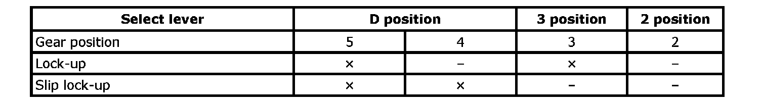 A/T Control System: Lock-up ControlThe torque converter clutch piston in the torque converter is engaged to eliminate torque converter slip to increase power transmission efficiency.