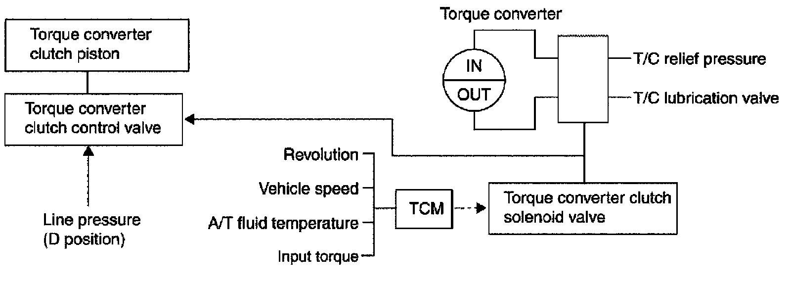 The torque converter clutch control valve operation is controlled by the torque converter clutch solenoid valve, which is controlled by a signal from TCM, and the torque converter clutch control valve engages or releases the torque converter clutch piston.