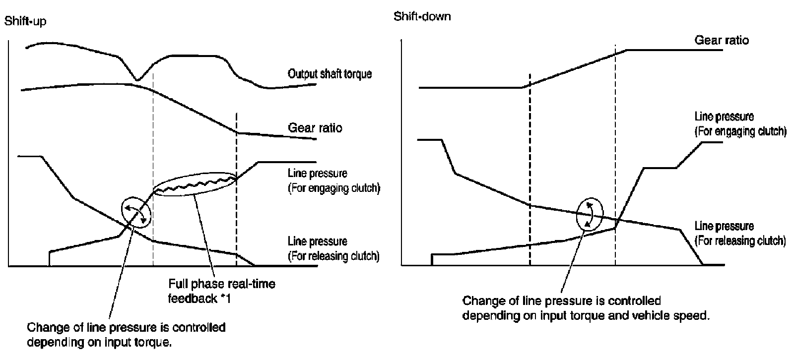 *1: Full phase real-time feedback control monitors movement of gear ratio at gear change, and controls oil pressure at real-time to achieve the best gear ratio.