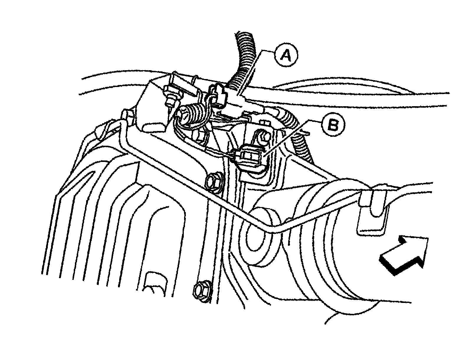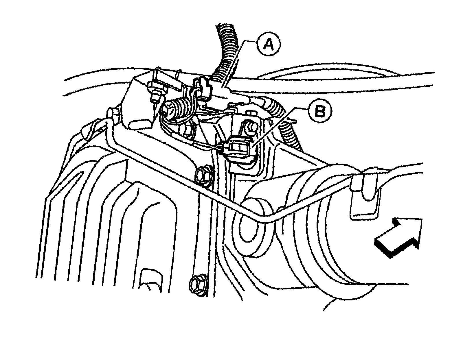 5) Remove differential lock solenoid connector (B) bolt and disconnect differential lock position connector (A).