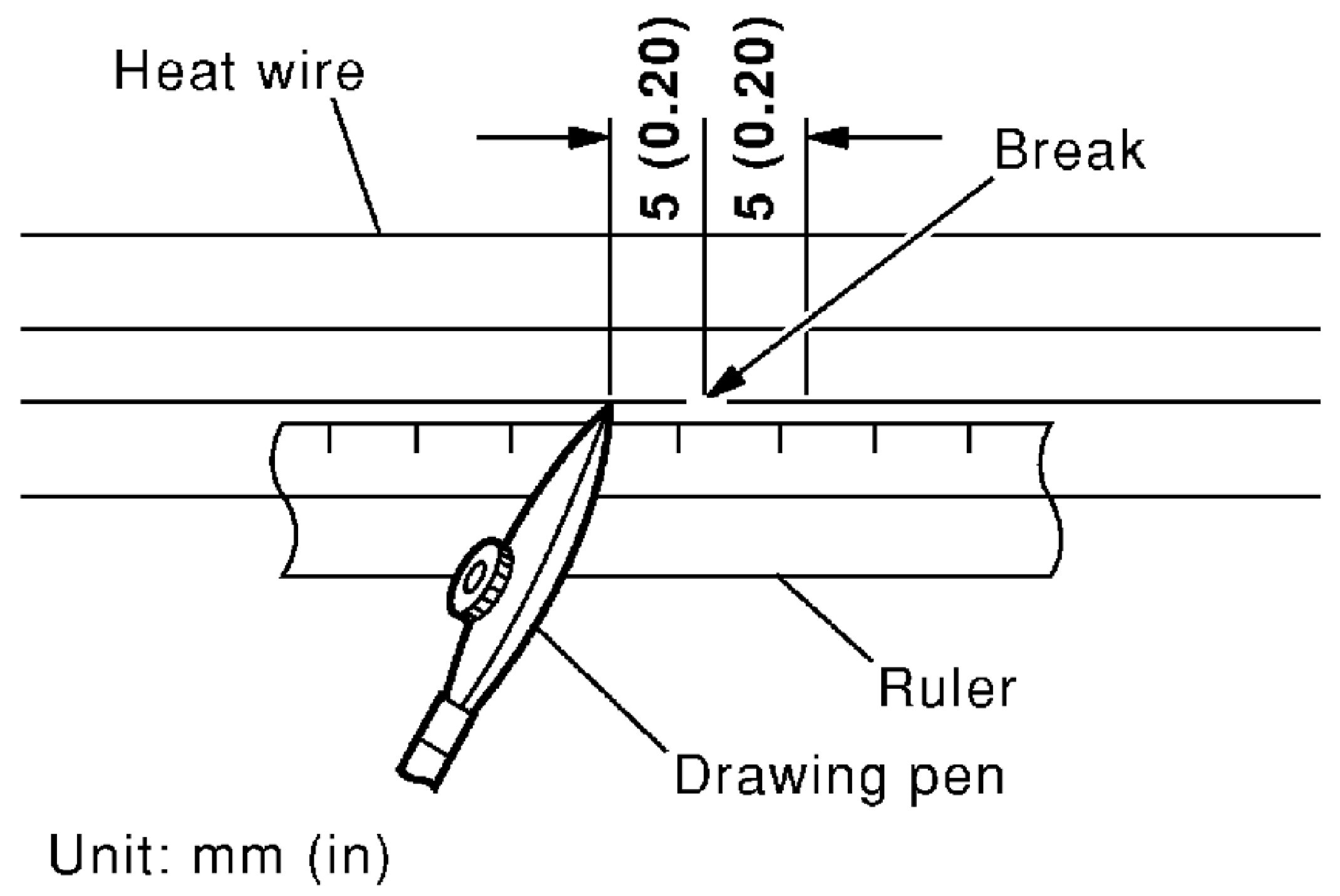 3. Place ruler on glass along broken line. Deposit conductive silver composition on break with drawing pen. Slightly overlap existing heat wire on both sides [preferably 5 mm (0.20 in)] of the break.