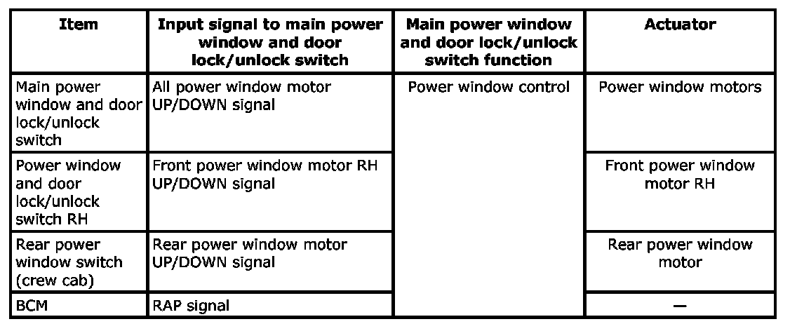 - Power window and door lock unlock switch RH & rear power window switches LH and RH (crew cab) can open/close the corresponding windows.