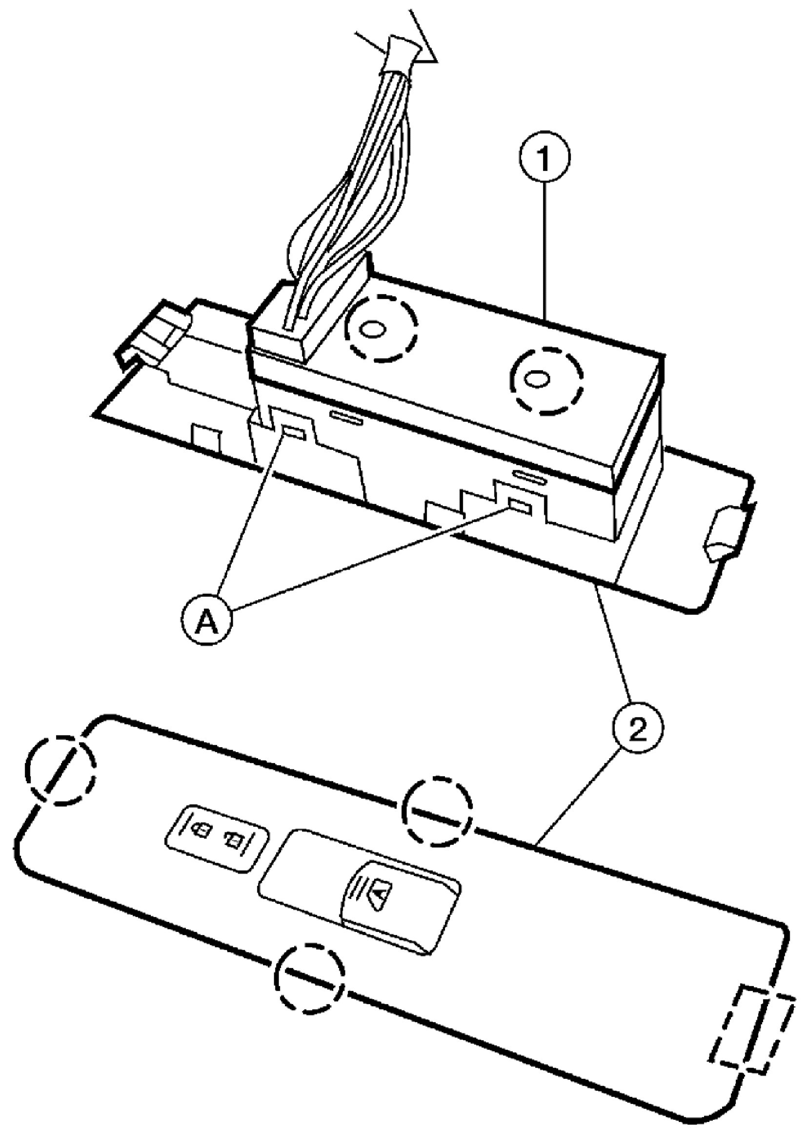 2. Release the four tabs (A), two on each side, then separate the front power window switch (1. from the finisher (2).