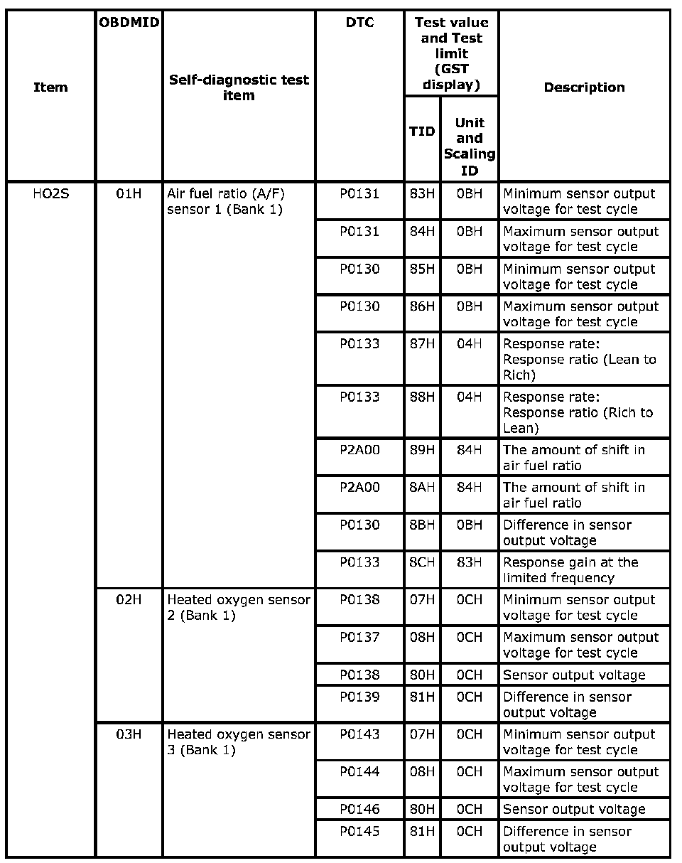 These data (test value and test limit) are specified by On Board Monitor ID(OBDMID), Test ID (TID), Unit and Scaling ID and can be displayed on the GST screen.