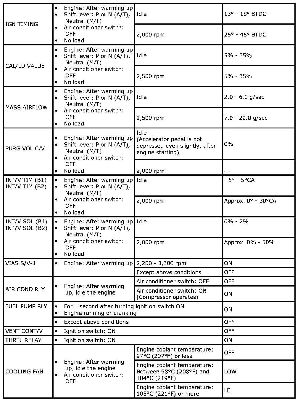 * Specification data may not be directly related to their components signals/values/operations. i.e. Adjust ignition timing with a timing light before monitoring IGN TIMING, because the monitor may show the specification data in spite of the ignition timing not being adjusted to the specification data. This IGN TIMING monitors the data calculated by the ECM according to the signals input from the camshaft position sensor and other ignition timing related sensors.