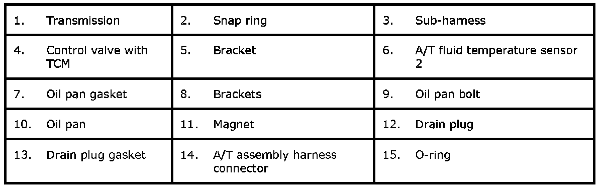 18) Refill the A/T with fluid and check the fluid level and for fluid leakage.