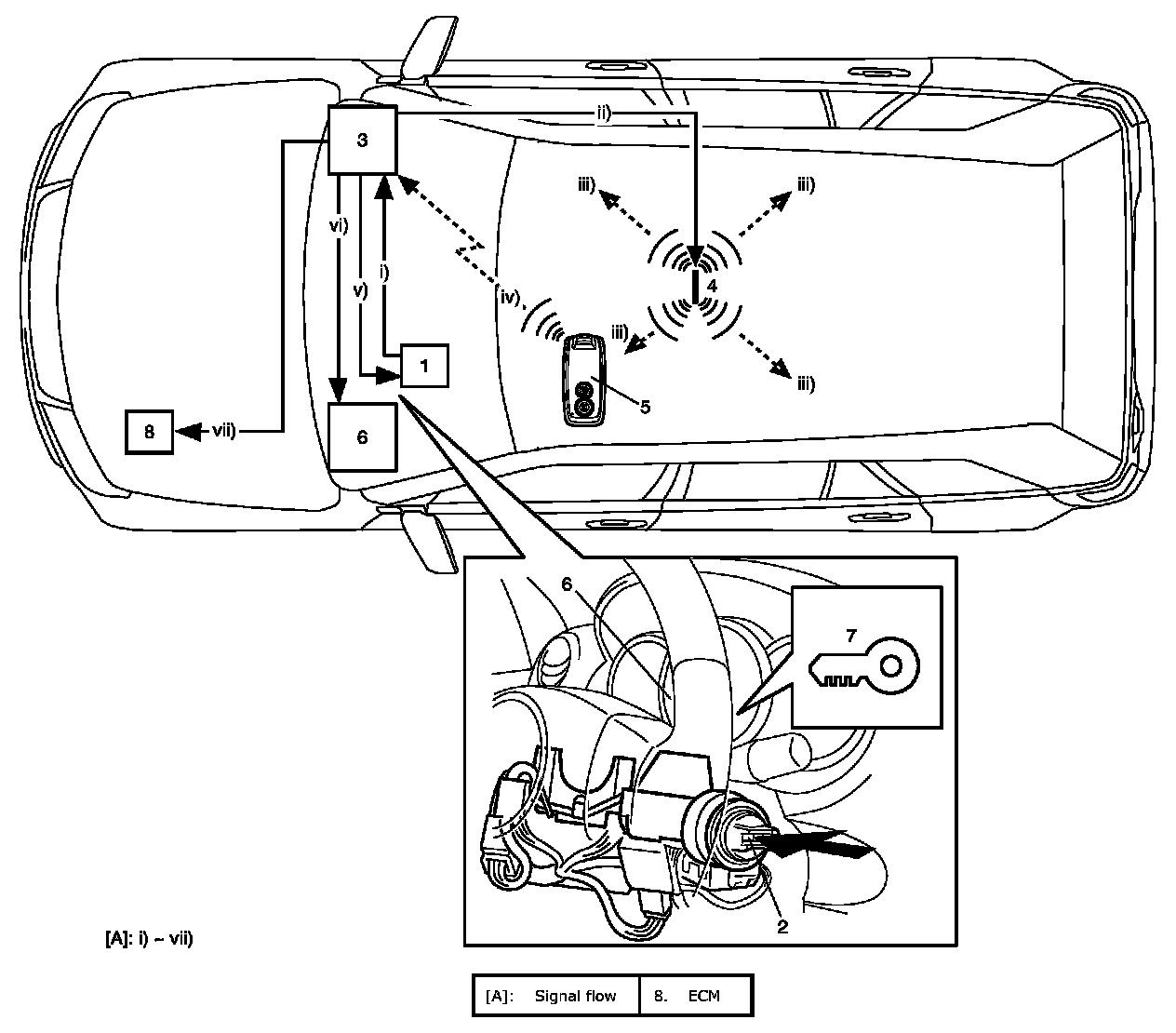 When the ignition knob switch (2) installed to the steering lock unit (1) is pushed, the keyless start control module (3) activates the center antenna (4) to send out the request signal in the vehicle compartment. When the remote controller (5) receives the request signal from the center antenna, it transmits the ID code to the keyless start control module. The keyless start control module compares the ID code sent by the remote controller with the ID code registered in the keyless start control module. When these ID codes match, the keyless start control module makes the key indicator light (7) in the combination meter (6) light in blue and unlocks the steering lock unit to enable the ignition knob switch to turn. When the ignition knob switch is turned to ON position in this state, ID codes of ECM and keyless start control module are compared through CAN communication (immobilizer function). When they match, turning the ignition knob switch to start position will start the engine.