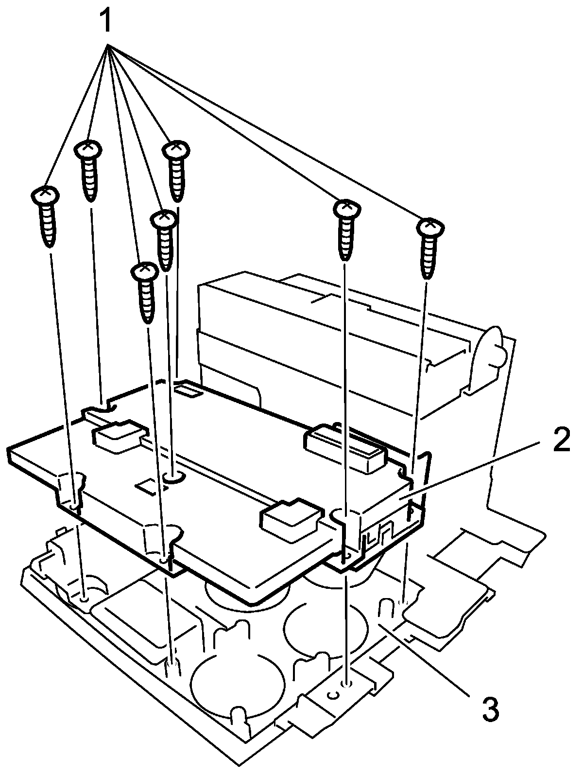 3. Remove HVAC control module mounting screws (1) and then, remove HVAC control module (2) from center garnish (3).