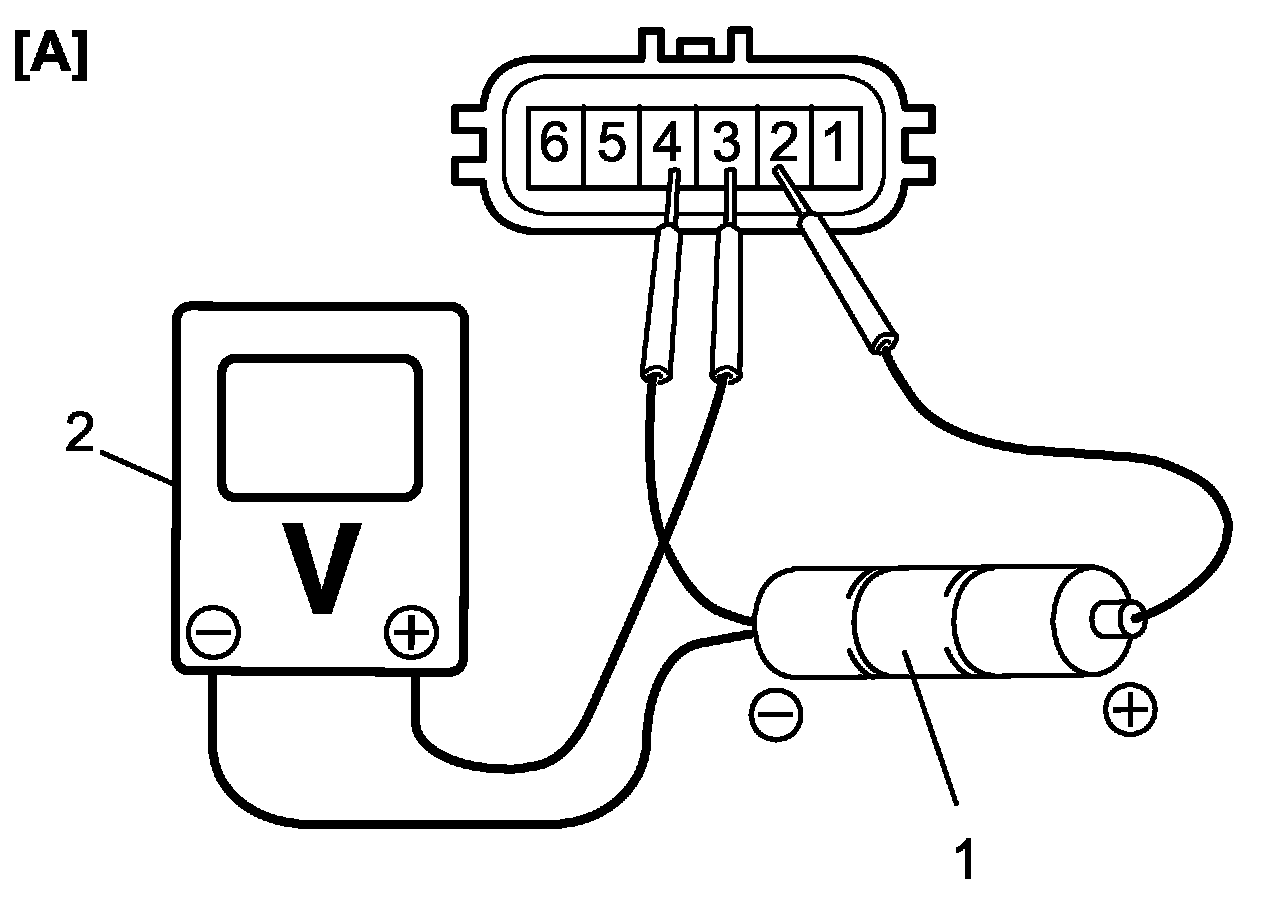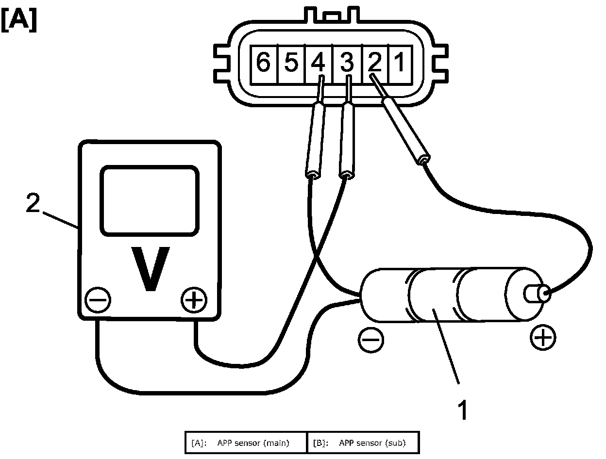 b. Connect voltmeter (2) and batteries to APP sensor as shown in figure.