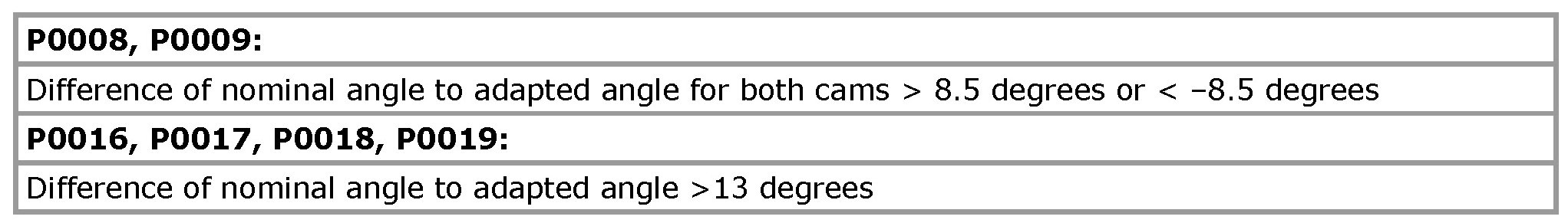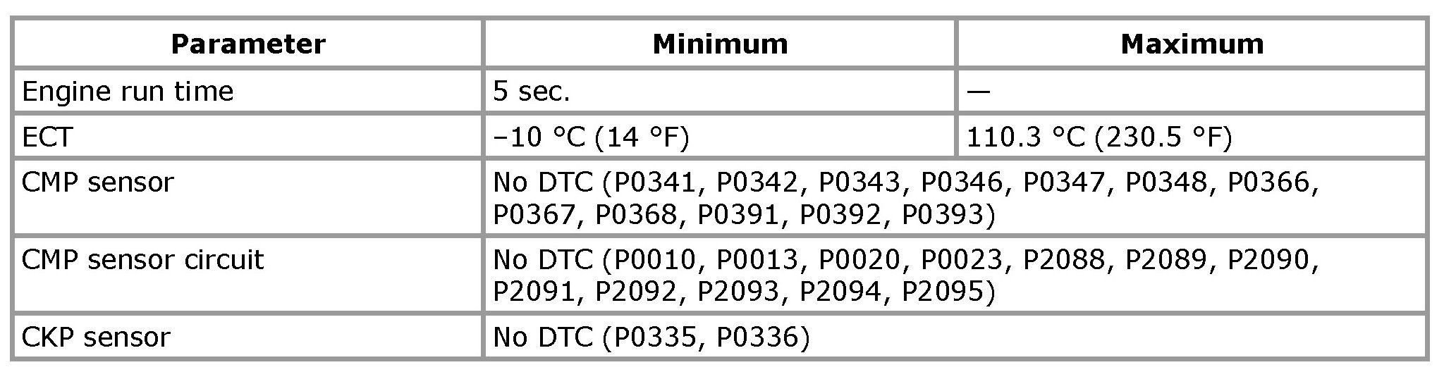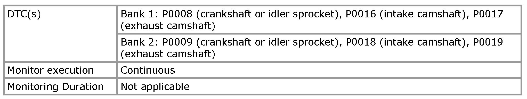 The ECM monitors misalignment between camshafts and crankshaft. Once the ECM learns the position of camshafts, the ECM compares the learned values to a reference value derived from crankshaft position. If learned values are out of specified range, the ECM will set DTC.