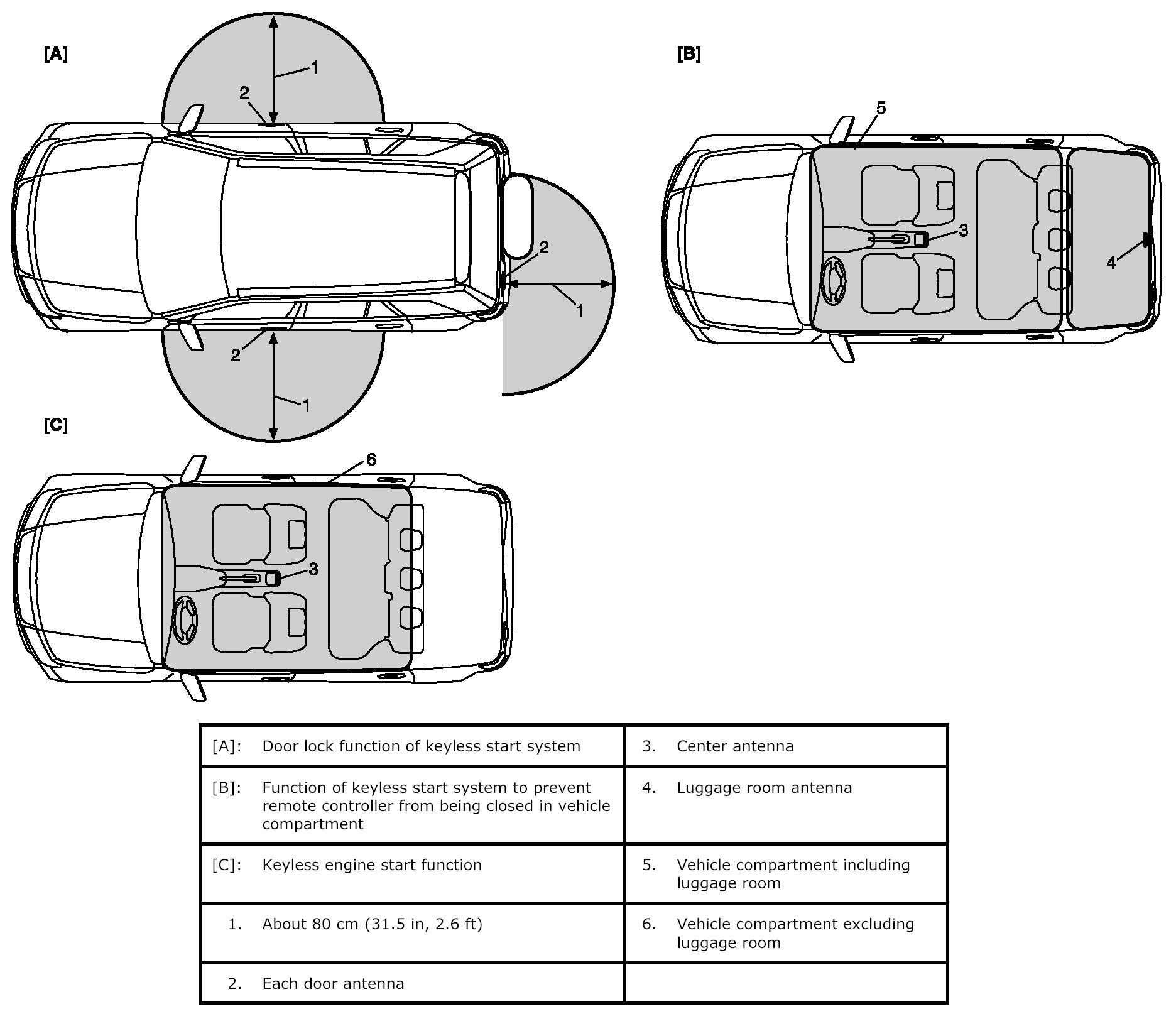 Description of Remote Controller Operation AreaShown below are the operation areas of the remote controller for the keyless engine start function and door lock function of the keyless start system.