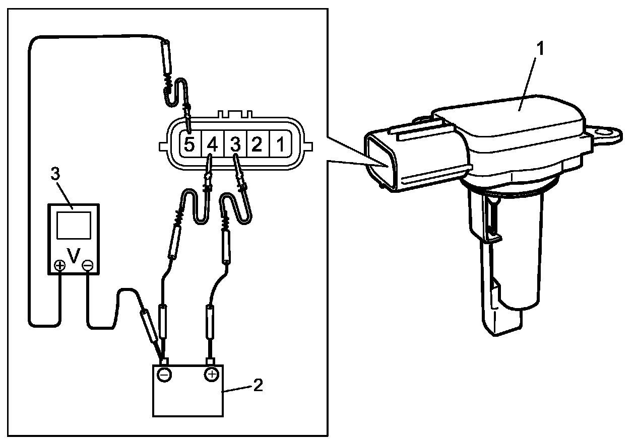 2. Connect battery (2) and voltmeter (3) to MAF and IAT sensor (1) as shown in figure.