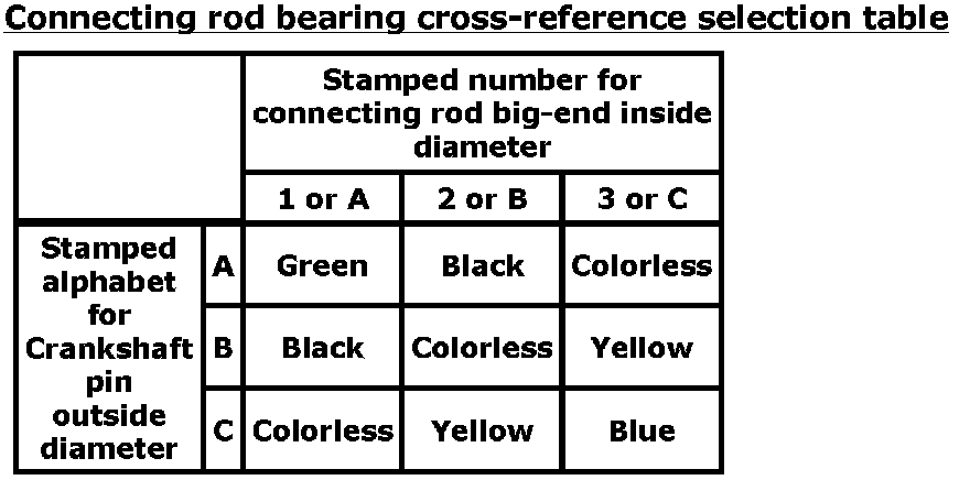 Stamped number for crankshaft journal diameter is "4", and stamped alphabet for cylinder block journal inside diameter is "A". Standard: 0.019 - 0.031 mm (0.00075 - 0.00122 in.)