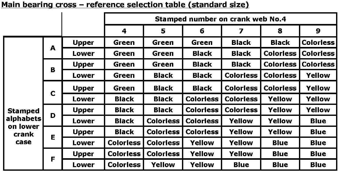 Stamped number for crankshaft journal diameter is "9", and stamped alphabet for cylinder block journal inside diameter is "F". Standard: 0.025 - 0.037 mm (0.00098 - 0.00145 in.)