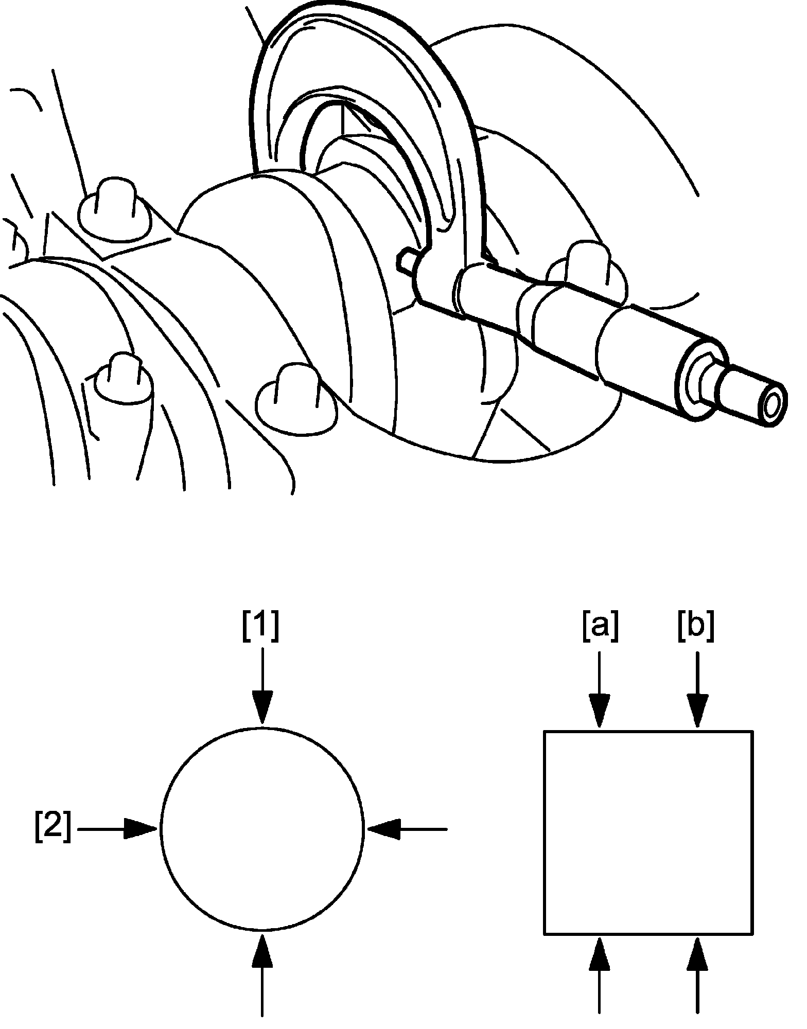 Crankshaft pin taper ([a] -[b]) and out-of-round ([1] -[2])
